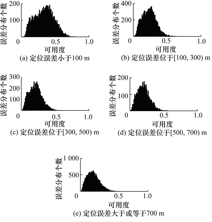 图 11为进行4万次Monte Carlo仿真的可用度分布情况。综合图 11中4万组数据,可用度大于0.4的数据主要集中在图 11a和11b中,对应的定位误差小于300 m,图 11e中可用度主要分布在小于0.4的区间,对应的定位误差不小于700 m。定位误差不小于700 m的可用度主要集中在0.4以内;定位误差小于300 m的可用度主要集中在0.4以上。定位误差越大,Q取值小的比例越大。因此,选取Q值最大的卫星观测数据进行定位。