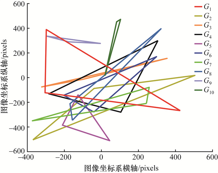 随机生成10组观测数据G1—G10进行验证,10种像平面投影如图 12所示。利用本文构型评价方法从10组观测数据中选择Q值最大的一组,同时利用PDOP筛选方法选择PDOP值最小的一组。发现2种方法筛选出同一组构型G1。这组卫星像素点分布最分散,像平面投影面积最大,符合本文评价方法的原则。10组观测数据进行P3P-Kneip算法定位的平均误差为393.5 m,而利用筛选出的最优构型解算的定位误差仅为93.4 m,验证了改进算法的有效性。