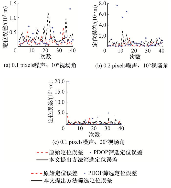 为验证改进算法的鲁棒性,进行40次模拟定位,每次拍摄1张星图,仿真中添加0.100 pixels的均值星图噪声,设置1张星图中有8颗卫星可作为定位数据源,选取其中3颗进行P3P-Kneip定位。构型优选后利用P3P-Kneip算法对单次观测数据进行定位解算,平均定位误差为185.4 m。利用PDOP筛选得到的最终平均定位误差为297.3 m;利用P3P-Kneip算法对原始观测数据进行定位解算的平均定位误差为384.9 m。40次定位误差分布如图 13a所示;添加0.200 pixels的均值噪声,定位误差分布如图 13b所示;改变相机视场角参数,添加0.100 pixels的均值噪声,定位误差分布如图 13c所示。这3种算法的平均定位误差如表 3所示,本文构型筛选算法的定位精度最高,更换光学相机后仍适用。在CPU主频为1.9 GHz的笔记本电脑上:本文构型筛选方法计算耗时0.060 s;PDOP筛选方法耗时0.020 s;未经筛选PnP定位方法平均耗时0.016 s。毫秒级解算时间可用于舰船行驶中的定位。