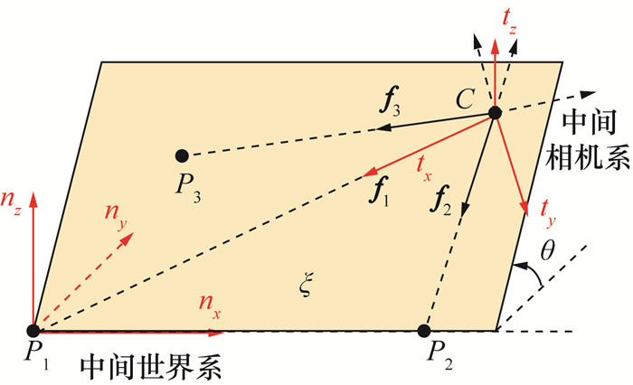 建立相机和世界坐标系的中间坐标系,如图 2所示,建立半平面ξ推导二者的变换关系,将P3P问题转化为一个四阶多项式的求解问题,表示如下: