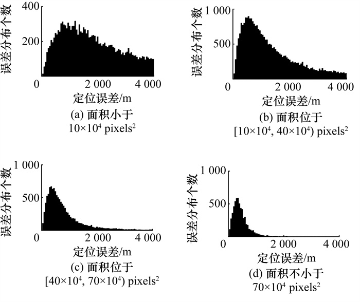 如图 4所示,当三角形面积小于10×104 pixels2时,定位误差较大,分布较分散;当三角形面积不小于70×104 pixels2时,定位误差主要集中在小于1 000 m区间内。但4个面积区间中在定位误差小于1 000 m的区间内均存在峰值,这说明图像中三角形面积并不是影响几何构型和定位误差的唯一因素,而是与其他因素耦合,共同影响几何构型和定位精度。