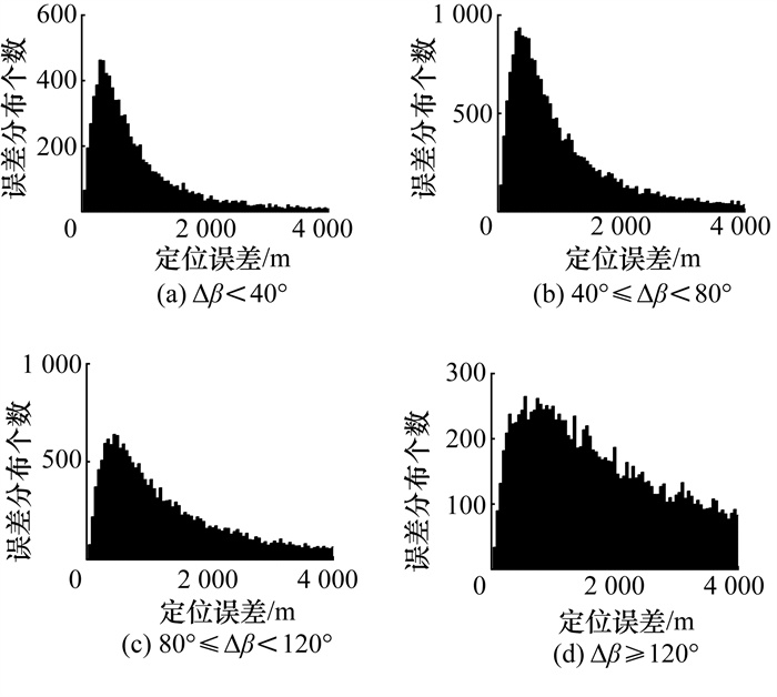 星座三角形的角度在一定程度上反映三角形的形状、3个星点的分布和四面体构型。本文经过多次统计与分析,得到不同角度差范围下定位误差的分布情况,如图 5所示。当三角形最大角与最小角的角度差Δβ≥120°时,定位误差分布较分散,大于1 000 m的占比较多;当Δβ<40°时,定位误差集中在小于1 000 m的区间内,并存在明显的峰值。因此,Δβ也是影响定位精度的因素之一。