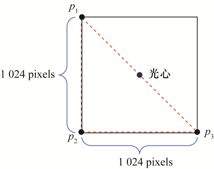 4 仿真校验与分析考虑当前主流相机视场角多为10°,本章仿真中设置相机视场为10°×10°、分辨率为1 024×1 024 pixels,如图 10所示。不失一般性,模拟星图像平面添加0.100 pixels的均值噪声。仿真中假设舰船惯导系统提供误差约2 km的初始位置。低速行驶的舰船在单次定位期间按静止不动处理,当已知3颗合作卫星的绝对空间坐标及其像平面二维坐标时,通过式(17)计算合作卫星与相机间的视线矢量fi,便可利用P3P-Kneip算法进行位置求解。需要说明的是,相机视场内3颗卫星并非必须隶属于同一星座,即使不同星座的3颗卫星,只要获取了卫星的图像坐标和实际位置,便可应用基于构型筛选的P3P方法进行定位。