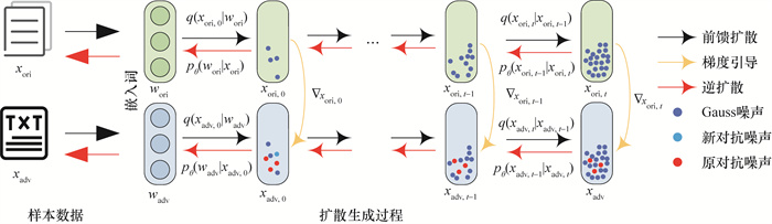 无论图像或文本的对抗样本生成,均是通过分析原始样本,进而生成与原始样本视觉上类似但机器会识别出较大信息偏差的对抗样本。对抗样本的生成过程与扩散模型[12-13]高度类似。扩散模型通过模拟自然界中常见的扩散过程来合成新数据,通过向噪声数据中添加细节的扩散过程来生成复杂数据,再通过反向逆扩散生成新的数据。扩散模型的有效性已经在目标检测[14-15]和自然语言处理[16-17]等多个领域得到验证。
