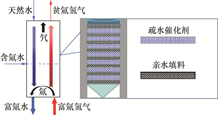 液相催化交换(LPCE)技术的主要作用是利用水-氢同位素催化交换反应(见式(1)),将较重的氢同位素由气相转移至液相。该技术对应设备为LPCE柱,工作原理如图 2所示。由图可知,在LPCE柱适当位置加入含氚水,在柱顶部加入天然水或顶部贫氚氢气的合成水,两者沿柱向下流动,在柱底部通入电解产生的富氚氢气,气相沿柱向上流动,气液两相氢同位素逆流交换,在亲水填料表面发生汽(蒸汽)-液相交换反应(见式(2)),在疏水催化剂表面发生汽-气同位素催化交换反应(见式(3)),实现在LPCE柱底部排出富氚水、顶部排出贫氚氢气的目标。