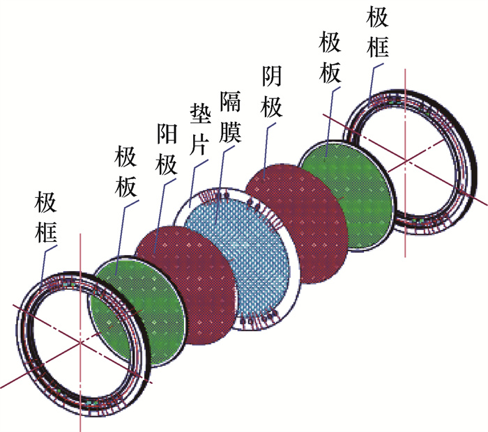 CECE装置中电解槽由于长时间储存高浓度的液体氚,必须满足液体滞留量小、密封性好、耐氚辐照性好、运行稳定性高等要求。目前CECE装置中常用的电解槽为碱性电解槽,其槽体结构如图 3所示,阴阳两极分别发生还原反应(见式(4))和氧化反应(见式(5))。1995年,AECL的Spagnolo等[39]曾报道了一种在50~80℃下运行的碱性电解槽,该电解槽液体滞留量为2.7 L/kA,运行电流为25 kA,槽体使用单一的不锈钢外壳密封以减少泄漏和辐照引起的材料性能恶化。此后加拿大的氚去除厂还采用了Stuart能源系统公司设计的电流为7.2 kA的碱性电解槽,液体滞留量为40 L,氢气产生速率为3 m3/h,该电解槽满足防泄漏、液体滞留量较低的要求。俄罗斯PNPI的CECE工厂采用了FS-525工业型碱性电解槽[40],氢气产量5 m3/h,1995—2010年的15 a运行期间,该电解槽仅进行了更换石棉隔膜和碱性电解质这2次维修。碱性电解槽虽然被广泛使用,但由于碱具有一定的腐蚀性,在实际使用中可能会腐蚀槽体和LPCE柱中的填料,还可能使LPCE柱中的催化剂逐渐失活,需要进一步改进或研发新型电解槽。