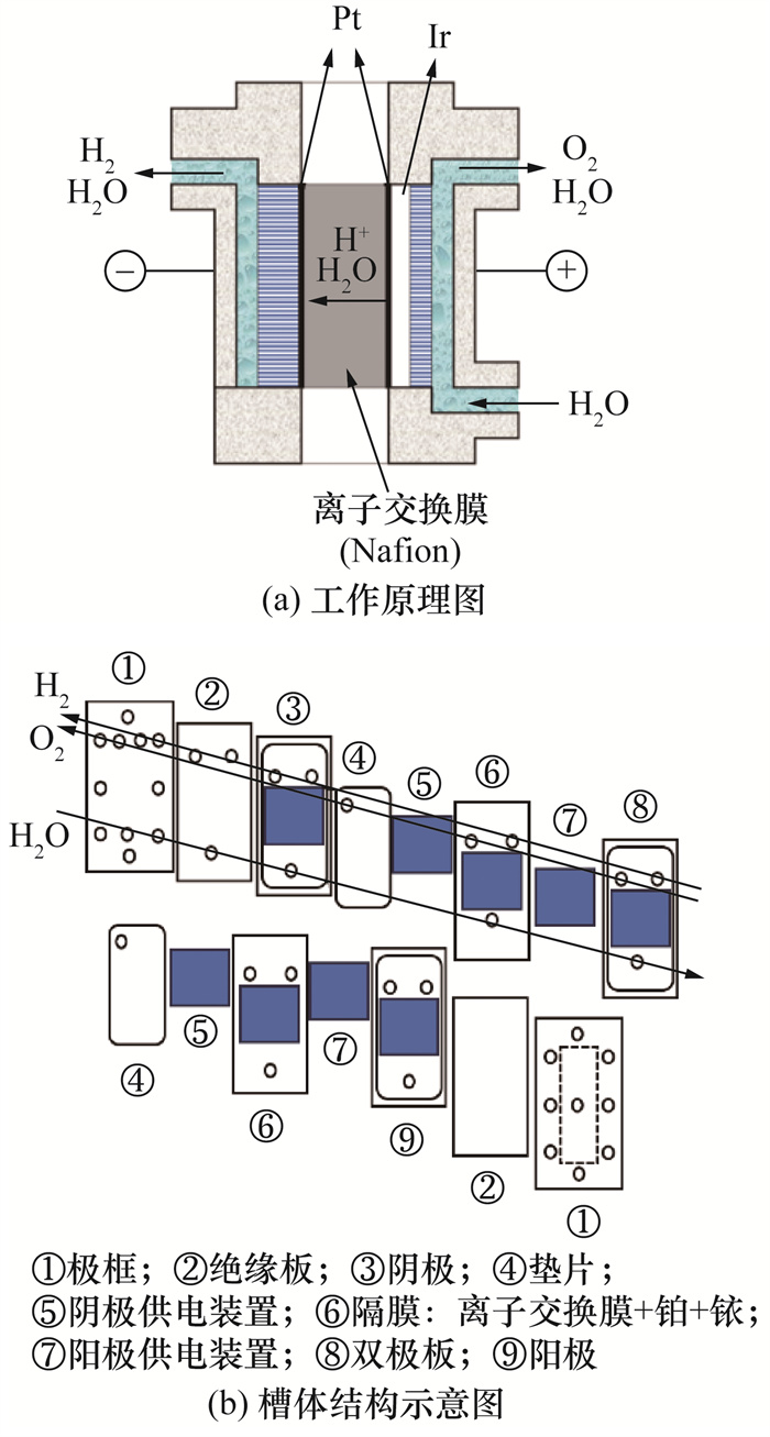 目前,国际上关于电解槽的研究主要集中在2个方向:一是研制更大氢气产量的电解槽,同时兼顾改进电解槽密封性、减少液体滞留量和建造成本[41];二是研发质子交换膜(proton exchange membrane,PEM)电解槽。PEM电解槽中的质子交换膜均为固态聚合物电解质(solid polymer electrolyte,SPE),部分研究团队也称之为SPE电解槽[42-43]。PEM电解槽的工作原理和槽体结构分别如图 4a和4b所示,阴阳两极分别发生还原反应(见式(6))和氧化反应(见式(7)),阴阳极之间为仅容H+通过的质子交换膜,阳极产生的H+通过质子交换膜进入阴极发生反应。相比于目前常用的碱性电解槽,PEM电解槽液体滞留量低,不含碱性电解质,不具有腐蚀性,防止了碱对LPCE柱中催化剂活性的影响,但目前市场上销售的PEM膜(如Nafion膜)均是高分子聚合物,对氚辐照较敏感,需要进一步提高PEM膜耐辐照性能。