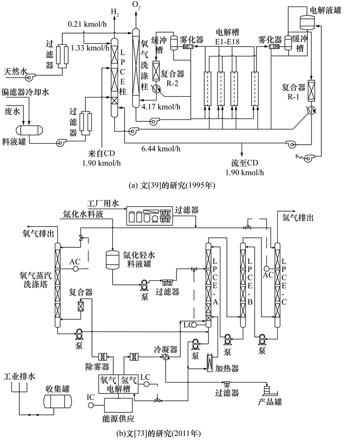 1 联合电解催化交换技术联合电解催化交换(CECE)技术由Hammerli等[15-17]于1978年提出并申请专利,之后开始快速发展。该技术由LPCE技术、水电解制氢技术和氢氧合成技术3大核心技术组成,各技术的关键设备分别为LPCE柱、电解槽和氢氧合成反应器,这3个设备的联用使水相和气相在CECE装置内部形成回流,除氚因子得到很大提高,适合处理含不同浓度氚的轻水。
