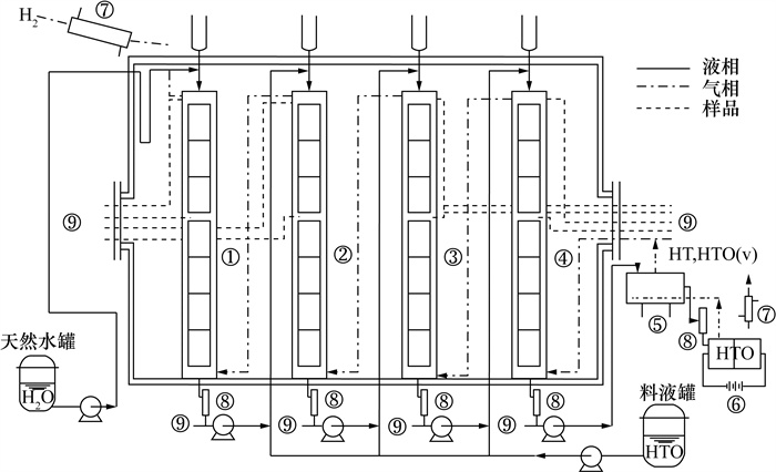 为推动CECE技术工程应用、掌握含氚轻水处理技术,加拿大[39, 73]、日本[74-76]、美国[77]、俄罗斯[78]、罗马尼亚[79-84]和一些其他国家[85-87]均开展了CECE工艺流程除氚研究,并提出了可操作的工艺流程。中国工程物理研究院也于“十五”期间建立了年处理量10 t重水的基于CECE和色谱工艺级联的中试规模实验系统,并在该系统上完成了含氚轻水中氕、氘、氚分离和氚提取的实验演示[88-89],经约240 h含氚轻水的连续运行实验,CECE系统中LPCE柱整体浓缩倍数约为4,电解槽氚分离因子约为10,经50 m3/d的色谱分离系统运行6 h,氚可浓缩1 000倍。