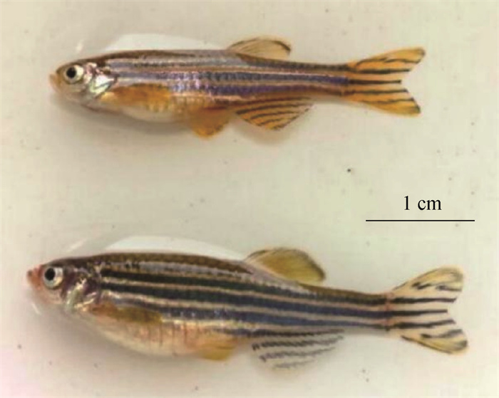 1 斑马鱼简介斑马鱼(Danio rerio)源自印度、尼泊尔、缅甸等国[11],如图 1所示,其全身遍布多条深蓝色条纹,因此又名蓝条鱼、花条鱼[10]。斑马鱼被用于实验室研究的时间较短,但发展十分迅速,目前已成为广泛使用的水生模式生物[12],具有对水体环境变化非常敏感、体型小、繁殖能力强、产卵量大且胚胎透明等优势[13]。除用于环境科学、药物毒理学、水产学、农学等领域外,已有越来越多的科研人员将其应用于放射生物学领域的研究,例如放射性射线对胚胎生长发育的影响、电离辐射对生物的种群效应、放射增敏剂和辐射防护药物研发等[14-17]。