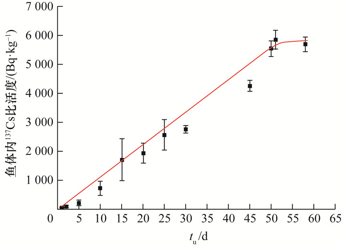 斑马鱼对137Cs的浓集曲线如图 4所示,其中tu为浓集时间。由图可知,实验初期斑马鱼对137Cs的吸收较快,其体内137Cs的比活度基本呈直线上升趋势;直至第50 d左右斑马鱼体内137Cs的比活度基本保持不变,达到平衡。将第50、51、58 d鱼体内137Cs比活度的平均值作为平衡状态时生物体内核素的比活度,并将对应天数水体中137Cs活度浓度的平均值作为平衡状态时水体中核素的活度浓度,计算得到平衡状态下,斑马鱼对137Cs的CF值为(5.81±0.23)L/kg。