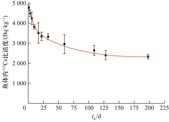 3.3 斑马鱼对137Cs的排出规律斑马鱼对137Cs的排出曲线如图 5所示,其中tb为排出时间。由图可知,实验初期斑马鱼体内137Cs比活度下降较快,直至第10 d左右,排出的速率开始降低。从第60 d以后斑马鱼体内137Cs比活度的下降曲线趋于平缓,下降速率减弱,在137Cs活度浓度为1 000 Bq/L的实验条件下,斑马鱼对137Cs的生物半排期Tb-1/2约为70 d。从第128 d至第198 d,斑马鱼体内137Cs比活度基本保持不变,维持在2 370 Bq/kg左右。