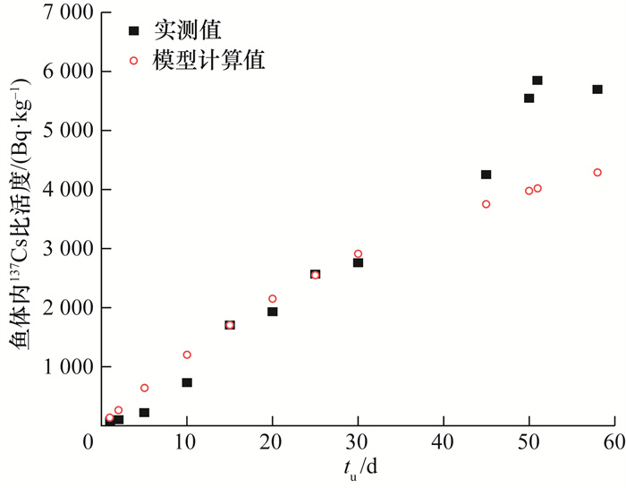 根据式(5)对各采样时间下斑马鱼体内137Cs的比活度进行计算,并与浓集实验中的实测值进行对比,结果如图 7所示。由图可知,除了浓集过程后期(tu>45 d),模型计算值与实测值的一致性较高。对于浓集过程后期尤其是达到平衡状态时,对应的137Cs比活度建议直接使用其平衡状态下的CF值进行计算。