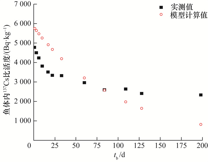 根据式(9)对各采样时间下斑马鱼体内137Cs的比活度进行计算,并与排出实验中的实测值进行对比,结果如图 8所示。由图可知,模型计算值与实测值的一致性较低。依据斑马鱼对137Cs的排出曲线(见图 5),斑马鱼体内的137Cs比活度在排出阶段后期(tb>128 d)基本不再变化,这可能是部分核素累积到斑马鱼肌肉等部位后,基本不再排出。