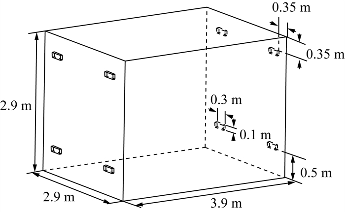 3 几何模型建立使用Solid Works软件对再悬浮箱体进行三维建模,如图 1所示。再悬浮箱体参考了法国核辐射保护及核安全研究所(Institute for Radiation Protection and Nuclear Safety,IRSN)的CEPIA试验平台所用的几何模型[14],空间尺寸为3.9 m× 2.9 m×2.9 m,模型箱体上端设置4个进风口,下端设置4个排风口,进风口和排风口尺寸均为0.3 m×0.1 m。在箱体底面产生具有放射性的铀气溶胶颗粒,进风口的通风引起箱体内气流扰动,导致气固交界面上放射性气溶胶颗粒因风力作用的再悬浮。