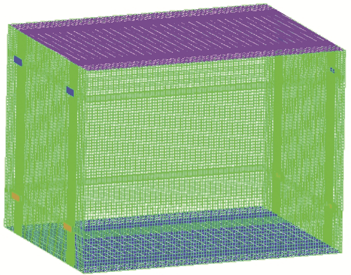 使用ICEM CFD软件进行网格划分,结果如图 2所示,再悬浮箱体的几何结构简单,六面体网格质量比四面体更好,在收敛性能上也明显更优,故采用结构化六面体网格对进排风口分别进行局部加密处理,划分网格总数为342 056个。