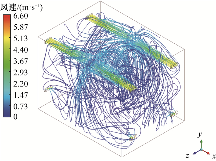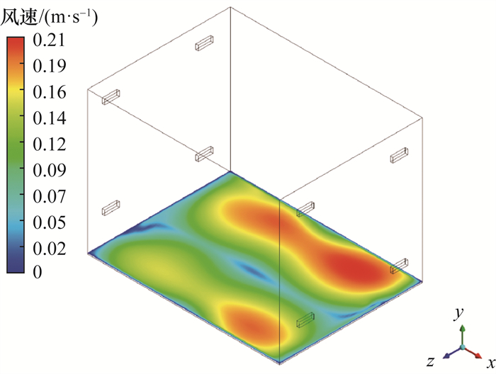 模拟得到的空间气流场分布结果如图 3所示。由图可知,整个再悬浮箱体内的气流场分布均匀,形成了较大的湍流,这表明这种进、排风口位置的布置方式具有一定的优势,能使箱体内形成较完整的涡流流动效果,整体速度分布也较均匀。