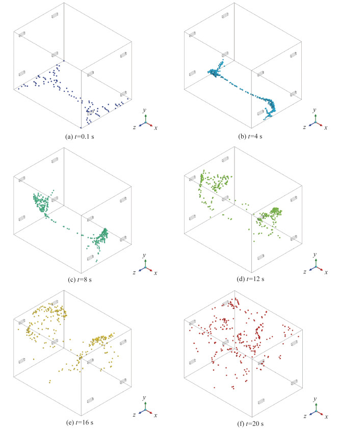 通过展现t=0.1、4、8、12、16、20 s时刻箱体内再悬浮气溶胶颗粒的运动分布状态,分析放射性气溶胶颗粒的再悬浮运动过程。如图 5所示,进风口的通风引起箱体内气流发生剧烈扰动,在箱体内形成了近似与平面x=0对称的气流场。0~4 s时,在空间内气流的带动下,地面上的气溶胶颗粒被风吹起并随气流逐渐向箱体侧壁面运动;4~8 s时,气溶胶颗粒到达侧壁面后,少部分颗粒会附着在壁面上,大部分颗粒转而继续向上运动;8~12 s时,靠近排风口的部分再悬浮颗粒会通过排风口直接排出,剩余的再悬浮颗粒被气流裹挟着继续向上运动;12~16 s时,再悬浮颗粒在箱体内环绕,经过进风口之后又向箱体中部运动;20 s时,气溶胶颗粒已经均匀地充斥在整个再悬浮箱体中。由此可见,进风口速度设置为10 m/s足以将地面的颗粒载带起来;20 s时箱体内气溶胶颗粒已经混合得十分充分,空间气流分布均匀。