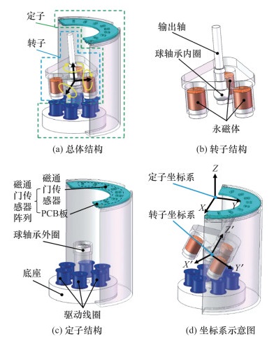 图 1a中的电机定子和转子通过球轴承内外圈之间形成的球面副实现三自由度旋转。图 1b显示了其定子上3个轴向充磁的相同圆柱永磁体,其产生的磁场既为电机线圈提供驱动所需安培力,同时也作为转子位姿测量基准磁场;图 1c为电机定子结构,电机底部基座定子安装有6个驱动线圈,顶部由16个磁通门传感器(FMS)组成的磁通门传感器阵列(FMSA)与定子基座固联,检测电机三自由度运动时所处位置的磁感应强度变化。