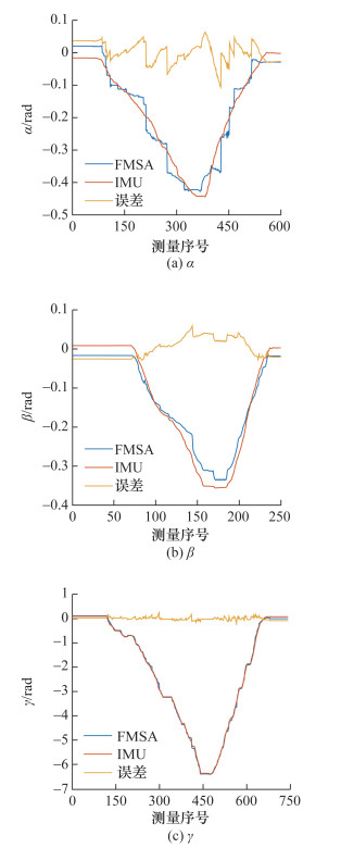 由图 10可见,所提方法的测量结果与IMU的测量结果基本吻合,由于环境噪声等因素,导致两者误差存在一定的波动。α、β和γ的均方根误差(RMSE)分别为0.031、0.025和0.056 rad。