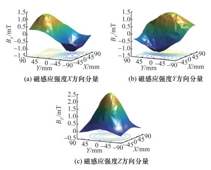由上可知,实现精确位姿解算的关键在于准确建立F。由于永磁体所产生的磁场强度空间分布具有极强的非线性,准确建立F较为困难,为了说明这一点,图 2给出了使用Maxwell 16.0软件得到的FMSA所在平面(XY平面)的标称磁感应强度各分量。尽管对于一般圆柱形永磁体磁场,可以通过分子电流模型和Biot-Savart定律得到多重积分形式的理论数学模型。然而由于多重积分计算量大等原因,难以直接基于这种理论模型进行高精度实时位姿解算。因此,一种高效、精确的磁场建模及其解算方法是实现基于磁场信息的多自由度电机位姿测量的关键。