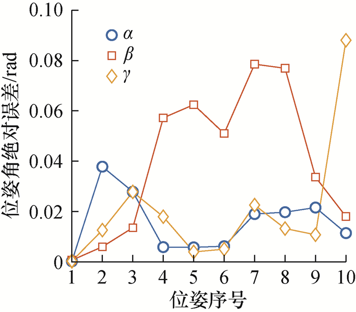 先假定磁场模型参数不存在偏差,电机的初始位姿设为X=(0.01 0.01 0.01)T, 待标定位置参数真实值设为Q=(-4 1 76)T,进行位置参数标定时式(9)的迭代初值设定为Y0=(0 0 0 0 0 80)T,位置参数标定结果如表 1所示。位姿测量时电机位姿各自由度等步长变化,每次增加0.03 rad,位置不变,由此针对10个位姿进行测量仿真,每个仿真50次后得到位姿平均测量误差如图 5所示。