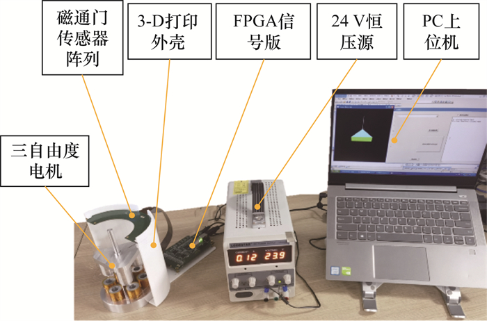 4 实验方案与结果 4.1 实验平台搭建的三自由度永磁电机位姿测量实验平台整体如图 8所示。电机固定于支架和FMSA的圆心处,FMSA通过螺钉和凹槽固定在外壳的圆柱面上,信号处理电路板搭载1块高性能FPGA(Xilinx公司XC3S1600E-4FG320) 进行磁传感器信号采集与处理。信号处理板与FMSA间通过柔性信号线连接,电源提供24V恒定电压。FPGA信号板对FMSA的磁场数据进行采样和信号处理后通过UART串口通信将磁场数据发送给PC上位机。上位机中利用Windows下的Win32子程序负责线程接收数据,RTX实时操作系统下的RTSS实时子程序实现精准、稳定定时,实时解算位姿,并将求解位姿结果实时显示于窗口。
