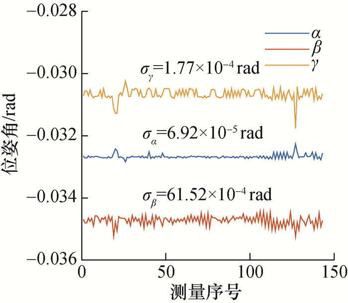 综合图 9中的σα、σβ和σγ可知,所提方法的位姿角测量分辨率不大于1.77×10-4 rad即0.01°。