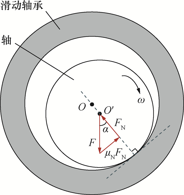 1 滑动轴承磨损试验滑动轴承的基本装配形式为转子-轴套配合,如图 1所示,轴承中心为O,转子在轴承的支承下绕轴向进行回转运动。转子质心为O′,转速为ω,受到径向力F作用。轴承内表面受到来自转轴的正压力FN和切向摩擦力μNFN,其中μN为表面摩擦系数。在润滑不充分的情况下,轴承接触位置易发生磨损,使得装配间隙增大,引起异常振动。相对于滚动轴承外圈-滚子-内圈的结构,滑动轴承结构简单,振动信号中的故障信息与前者存在较大差异。