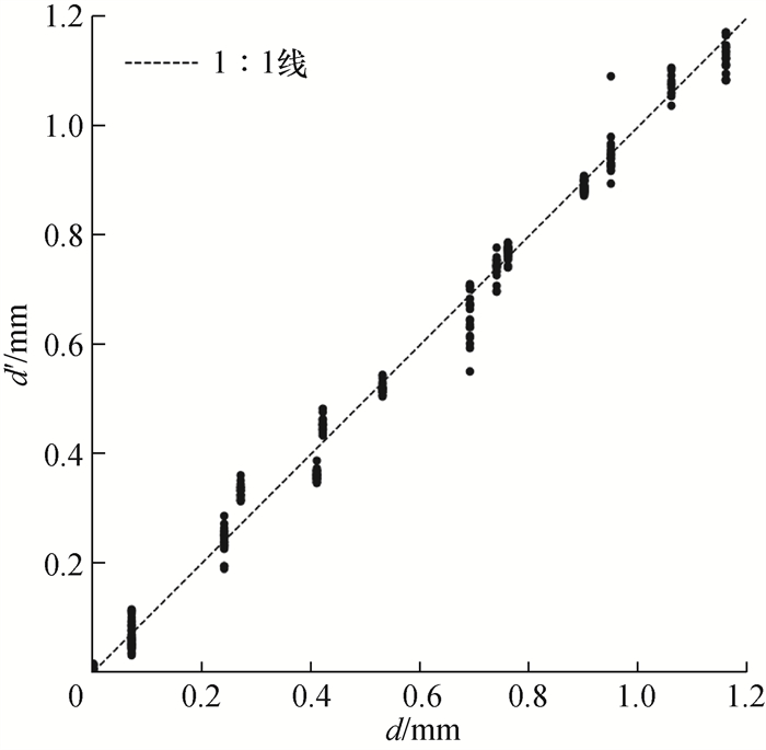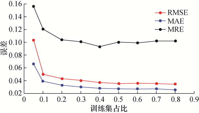| $ e_{\mathrm{RMSE}}=\sqrt{\frac{1}{N_{\text {test }}} \sum\limits_{i=1}^{N_{\text {test }}}\left[d_{i}^{\prime}-d_{i}\right]^{2}}, $ | (25) |
