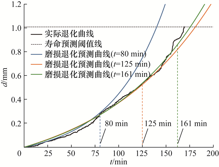 采用指数模型作为滑动轴承磨损退化模型,用以刻画轴承d随t的变化趋势[33]。数学公式如下: