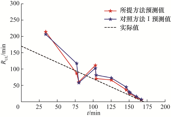 在4.1节所采用的4种对照方法中,方法Ⅰ的RMSE、MAE、MRE均最小。本节使用对照方法Ⅰ的诊断结果基于常规最小二乘法拟合指数模型,得到的预测结果如图 16所示,由图可知,初期RUL预测值与实际值差异较大,而随着t增大,二者趋于一致。