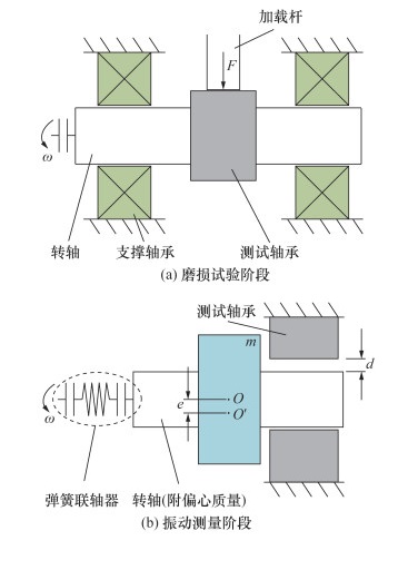 1) 滑动轴承磨损试验阶段,测试轴承内表面与转轴中段接触,轴承周向上保持不动,径向上受到来自于加载杆的固定载荷F作用,转轴两端使用圆柱滚子轴承作为支撑轴承,轴向和径向上受到固定约束,周向上保持恒速旋转,如图 2a所示。试验中使用自润滑石墨黄铜轴套作为测试轴承,与之配合的转轴材料为GCr15轴承钢。该阶段中测试轴承由健康状态转变为磨损状态。