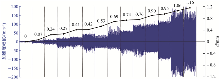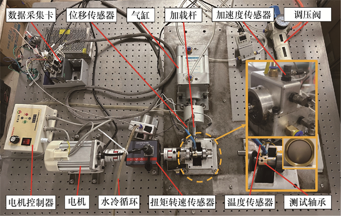 搭建的滑动轴承磨损试验台如图 3所示,气缸通过加载杆对测试轴承表面施加径向载荷,使用位移传感器测量加载杆的位移,用于表征试验过程中的轴承最大磨损深度;将PCB352C33单轴加速度传感器部署于轴承座表面以采集轴承振动信号。