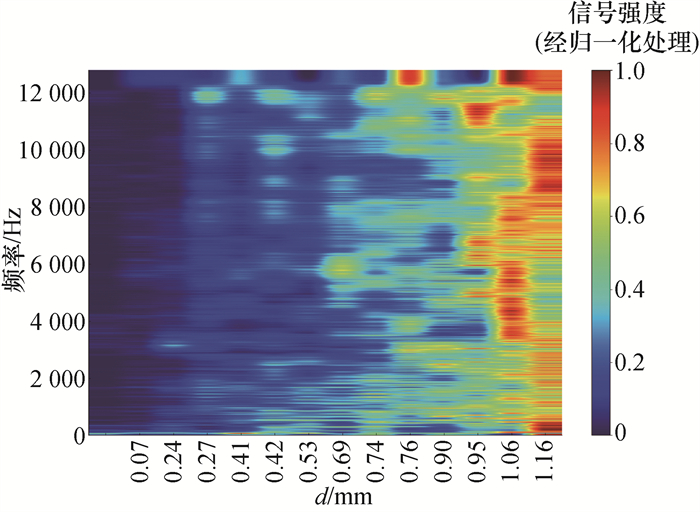 绘制YT的频谱图如图 7所示,为方便观察各频率分量的变化趋势,已沿横轴进行了归一化。横轴为不同的d值,纵轴为信号的不同频率分量,颜色代表经归一化处理后的信号强度。由图可知,随着d增大,不同频率分量下的信号强度整体呈增大趋势。