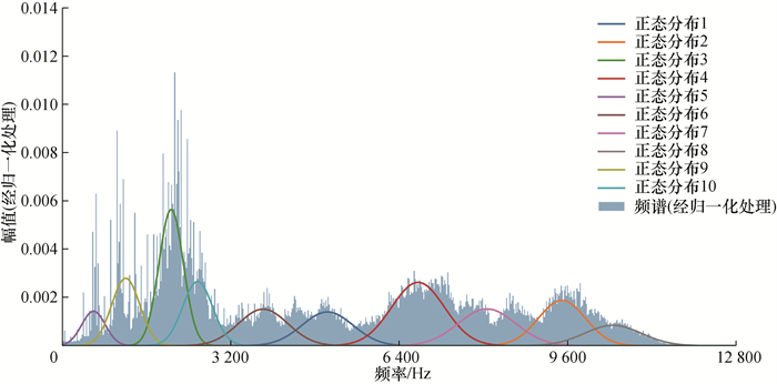 频域特征方面,对轴承频域幅值谱进行混合正态分布分解,如图 9所示,得到10个正态分布以及对应的均值