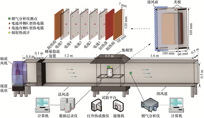 试验布置如图 1所示,LIB模块竖直放置在试验平台中央,试验平台左右两侧分别设有送风道和排风道,轴流风机连接调速器后固定在送风道左侧,送风道内安装有蜂巢稳流装置,实现可调稳定风场,截面风速范围为0~10 m/s。试验平台上方的集烟罩用于收集烟气,LIB模块上方和排风道内设有VARIO plus烟气分析仪探头,以0.5 Hz的频率测量LIB模块在试验过程中O2和CO2等气体的体积分数。试验平台正前方放置30 f/s的摄像机和红外热成像仪,记录试验中LIB模块TR过程和现象。