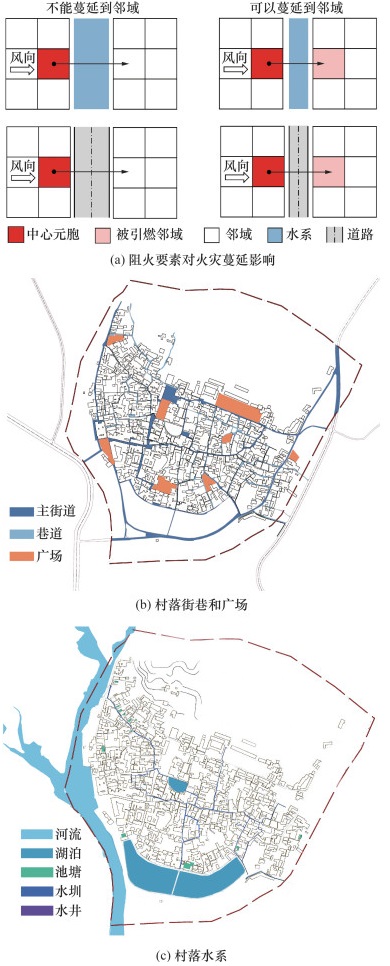 | 图 3 村落中水系和道路对火灾蔓延影响 |