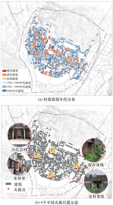 | 图 4 村落建筑年代分布与火源位置 |