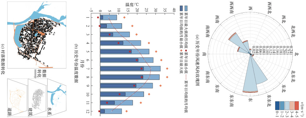 本文以徽州集聚型传统村落宏村为研究对象,根据实地调研和与当地消防队进行访谈后得出,夏季是宏村的旅游旺季,客流量大,商铺营业时间长,易引发火灾事故。夏季的七、八月份温度最高,平均温度在27 ℃,根据历史气象数据[23]和实地测量可知,该地区风向以东风为主,v为1~3 m/s,如图 6a和6b所示。因此本研究设定东风为主要研究风向,v为1~3 m/s,环境温度设定为27 ℃。