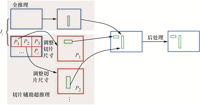 切片辅助超推理(slicing aided hyper inference,SAHI)是一种用于微调和推理阶段解决小目标检测问题的通用框架。具体来说,将图像分割成若干个子图像,从而增加微小目标的像素面积。如图 4所示,任意一幅图像Ij(蓝色框)在推断过程中都会被分割为l个重叠的切片(红色框),记为P1, P2, …, Pl。通过保持长宽比来调整切片的尺寸,同时对每个切片包含的内容进行预测。在此期间,随着切片尺寸的减小,模型对于较大目标的检测性能可能会降低。因此,为了更准确地检测较大目标,使用非极大值抑制(non-maximum suppression,NMS)算法NMS[20]将重叠图像的预测结果与原始图像的全推理(full-inference)相结合,并最终将其转换为原始图像尺寸。