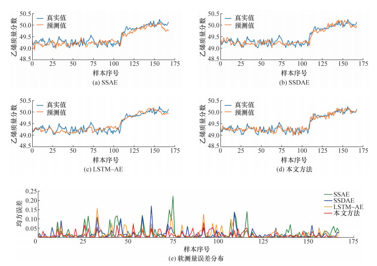 2.3 结果分析与讨论将2.2节所提到的历史数据和变量筛选方法用于建立基于梯形网络的半监督软测量模型。同时,为了验证结合了无标签数据的半监督软测量方法的优越性,将本文方法与支持向量回归(SVR)、偏最小二乘回归(PLS)、人工神经网络(ANN)、长短时记忆网络(LSTM)等4种有监督学习方法进行对比,此外,还与半监督自编码器(SSAE)、半监督降噪自编码器(SSDAE)、长短时记忆神经网络(LSTM-AE)3种经典的半监督方法进行对比。