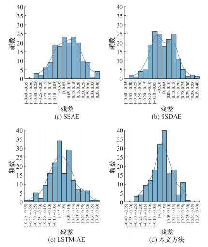 对比图 5中的4种半监督软测量方法的误差分布图并结合表 1中评价指标,可以看出本文方法的整体残差更小,说明该方法的整体预测误差较小,预测精度更高。为了更直观地对比4种半监督方法的预测残差,对半监督方法的预测残差进行分析,残差分布如图 6所示。当模型能够准确描述变量间的关系时,预测残差应该符合正态分布,表明模型产生的误差是随机误差而不是因为模型预测能力不足而产生的系统误差[13],图 6中本文方法的残差分布更符合正态性假设,表明该方法比另外3种半监督方法的预测效果更好。
