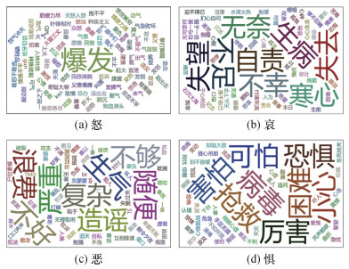 利用微博官方提供的应用程序编程接口(application programming interface,API)根据事件话题对该事件的微博数据进行采集,采集时间范围为2020年1月30日—2月14日。累计采集微博博文与评论数据74 409条,每条数据包含用户名称、ID、发布时间、发布内容以及转评赞数量。经过清洗、去重与筛选后,实际使用数据为57 291条。采用大连理工大学信息检索研究室开发的“中文情感词汇本体库”[24]为基础词汇库,补充事件相关词汇后,对湖北红十字会事件的微博数据进行情感判定,负面情绪词云分析结果如图 7所示。根据以上情绪计算结果,对湖北红十字会事件中的网民情绪进行分析。在此次事件中,各种情绪都有所体现,但总体以负面情绪为主。
