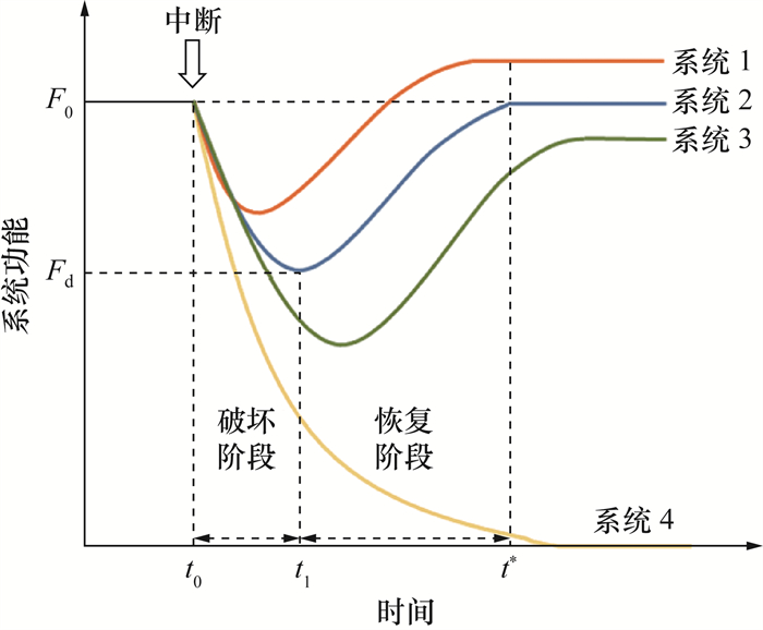 以系统2为例。在破坏阶段(t0≤t≤t1),系统在t0时刻受到中断干扰,在t1时刻系统功能F降到最低水平Fd。鲁棒性(robustness,R)能够很好地衡量该阶段系统吸收风险并维持基本功能的能力[24],