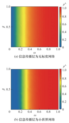 3.1 信息传播层网络结构对系统的影响信息传播层网络结构决定了风险信息在网络中的流动路径、传播速度以及传播范围。现实生活中,大多数网络呈现出无标度或小世界网络的特征。本文分别生成包含463个节点且平均节点度为2的小世界和无标度网络来探究上层网络结构对汽车供应链中风险传播过程的影响。图 6为在不同信息传播层网络结构下,系统达到稳态时有风险意识节点的比例ρA随着β与ω的变化情况,其他参数为:I0=10%, δ=0.2, μ=0.2, α=0.5, k=0.5。结果表明,随着ω不断增大,风险信息广泛传播,网络中有风险意识节点比例增大。当ω处于0~0.4之间时,上层为无标度网络,能够促进企业间信息传播;当ω>0.4,小世界网络因节点间平均路径较短,能够高效传播信息到整个网络,有意识节点的比例ρA略高于无标度网络。