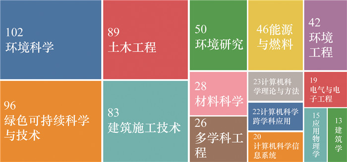BIM全生命周期碳排放控制领域的文献分布如图 2所示。环境科学和绿色可持续科学与技术领域最受关注,分别占总文献篇数的17.29%和16.27%;土木工程和建筑施工技术也吸引了不少学者的关注,分别占总文献篇数的15.08%和14.07%。