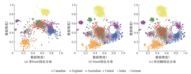 首先,本文从每种口音的测试数据中随机挑选200条;其次,提取每条数据的隐层编码特征;再次,计算CTC输出层的softmax概率,获得每一帧输出标签和对应位置索引;最后,根据上述获得的信息,分别计算编码器隐层特征非blank帧、所有blank帧、所有帧的统计池化特征,经过t分布随机邻域嵌入(t-distributed stochastic neighbor embedding,t-SNE)降维后进行可视化,分别如图 3a、3b和3c所示。经可视化分析可知,大部分口音特征由blank帧组成,其分布与所有帧特征分布基本一致,而更能反映口音差异的非blank特征未发挥主要作用,因此,本文将有效标签对应的尖峰帧作为口音识别的特征,以更好地区分不同地区口音的差异。