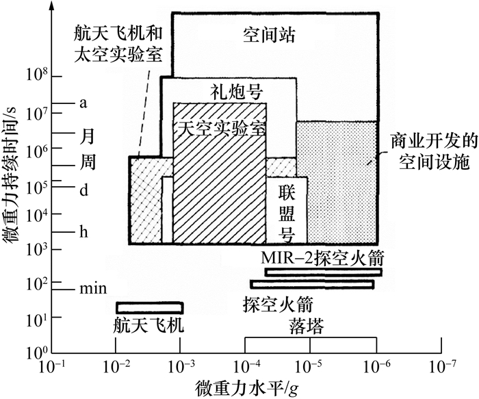 燃烧科学一直是微重力科学中的重要领域,日本东京大学于1957年进行了首次自由落体的地基微重力液滴燃烧实验[1-2],美国航空航天局(National Aeronautics and Space Administration,NASA)在Apollo航天器火灾[3-4]后进一步重视了燃烧科学的发展,在1970—1990年持续资助了大量地基微重力科学实验[5-8],使用的设施包括NASA Lewis研究中心的2座落塔(The NASA Lewis 2.2-second drop tower、The NASA Lewis zero-gravity facility (5s自由落体时间))及Learjet 25失重飞机。图 1总结出了不同设施的微重力实验时长以及代表性的微重力水平[5],可以看出落塔可实现短时间内10-4 g(g为重力加速度)或更低的微重力水平,失重飞机可提供10 s级的微重力实验时长,但是由于重力水平振荡无法稳定维持较优的微重力水平。为争取到更长的微重力实验时间,各国研究者逐渐聚焦于航天飞机(space shuttle)、空间实验室(skylab)及载人空间站的建设。选择适当的微重力实验设施与燃烧过程的时间尺度和微重力水平需求息息相关。