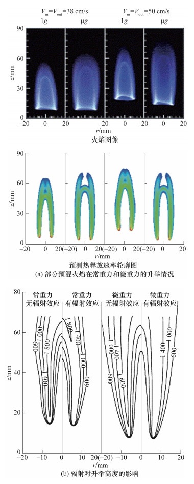当火焰中具有碳烟或其他颗粒物时,有些工况的火焰动力学同时考虑碳烟辐射现象,相较于常重力的射流火焰,微重力的火焰通过更大的辐射热损失降低火焰温度,通过更慢的特征流体速度增加燃料滞留时间,这些因素直接影响碳烟的生成[77]。Kong和Liu[78]针对不同流速和重力的层流同流甲烷扩散火焰进行了数值仿真,模型中使用了基于统计窄带相关- k的宽带辐射模型,包括了CO、CO2、H2O和碳烟的辐射,使用离散坐标法解析辐射强度,结果如图 20所示。
